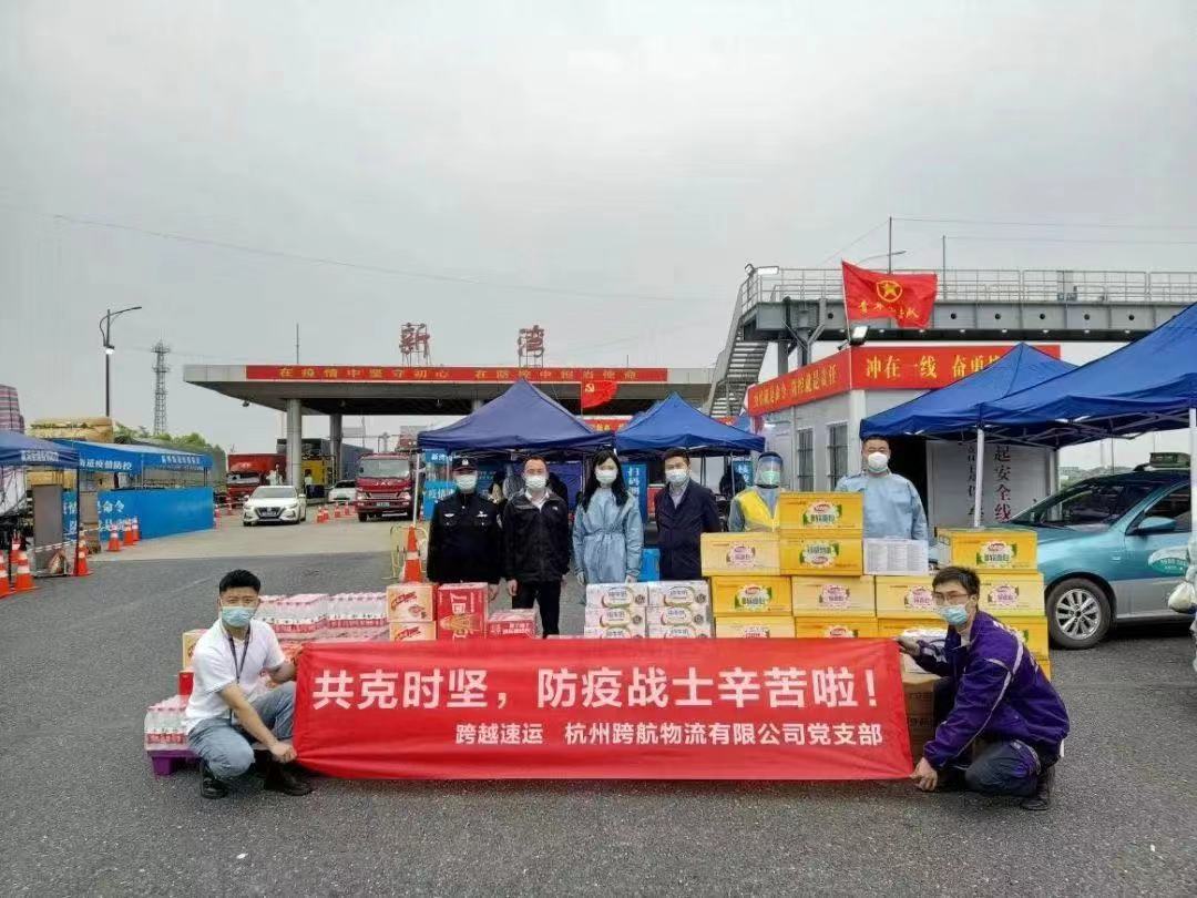 從4月15日到16日,跨越速運杭州跨航物流公司黨支部分別向杭州前進街道辦、前進派出所、新灣高速出口和湖州乾元鎮工業辦公室等多個地方捐贈了大量的礦泉水、能量型飲料、八寶粥、面包、純牛奶等生活物資以及醫用口罩、免洗消毒液等抗疫物資。